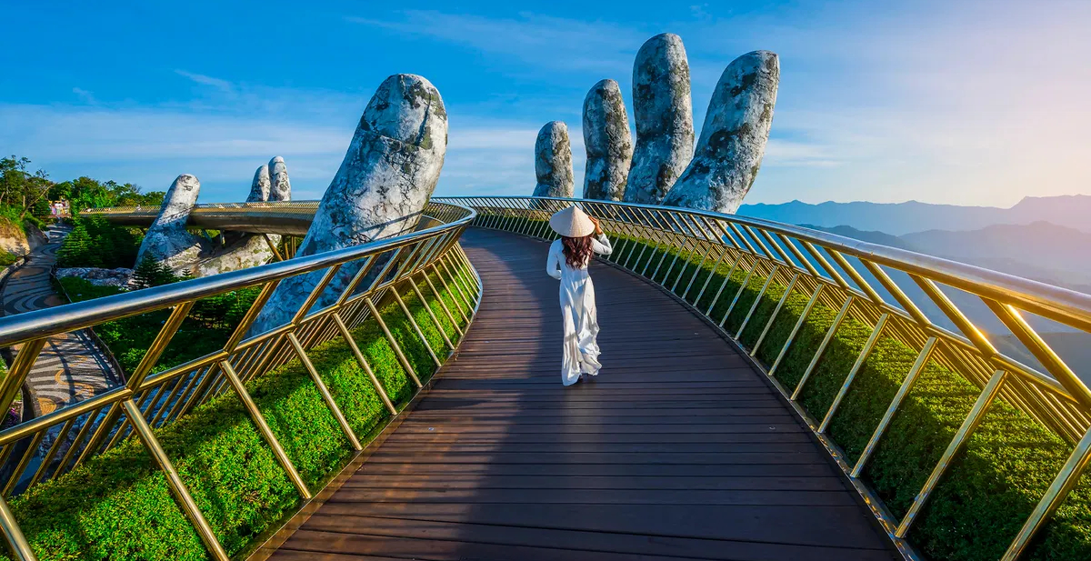 From there, the adventure continues to Da Nang. Explore mystical caves and pagodas in the Marble Mountains, enjoy a lantern-lit boat ride in Hoi An Ancient Town, and capture the magic of floating lanterns for good luck. At Ba Na Hills, stroll across the famous Golden Bridge held by giant stone hands, ride scenic cable cars, and laugh your heart out at Fantasy Park.